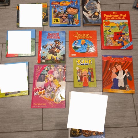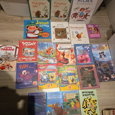 Pakke med diverse barnebøker. Bildene viser flere titler, blant annet bøker om brannbilen, toget og en bok av Cressida Cowell. Bøkene er illustrerte og egnet for barn som liker enkle fortellinger med bilder. Selges samlet som pakke.