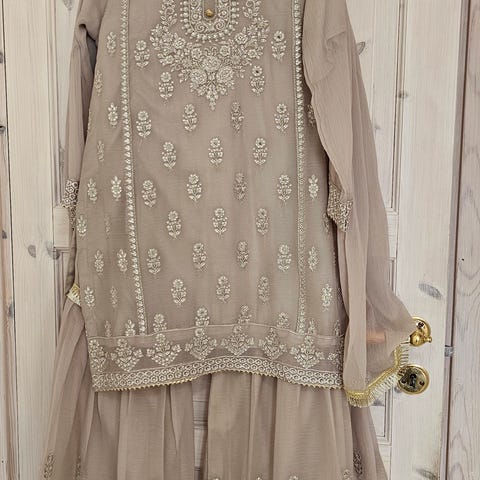 Selger veldig fin kameez shalwar i organza stoff broderier i front i lilla , rosa og gul farge .Kjole for jente i størrelse 146. Passer 9-11år.