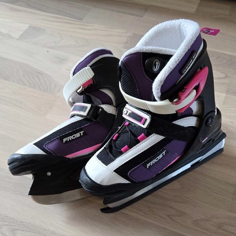 Frost ishockeyskøyter for barn i størrelse 36-39. Skøytene har yttermateriale i syntetisk materiale og er laget for bruk til ishockey. Fargekombinasjon grå og blå. Modellen har justerbare stropper og spenner for å feste skøytene rundt foten. Egnet for barn som trenger skøyter til lek og enkel ishockey på isbaner.