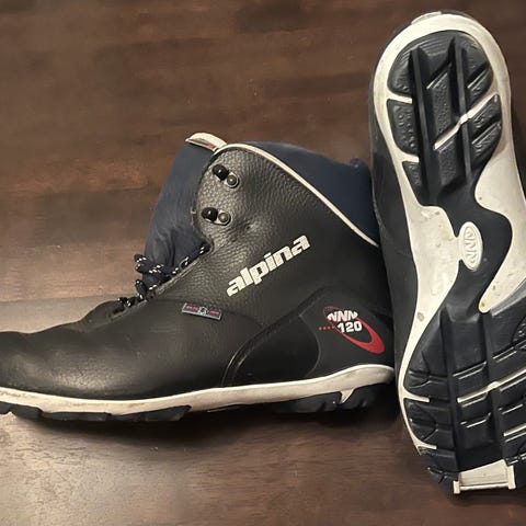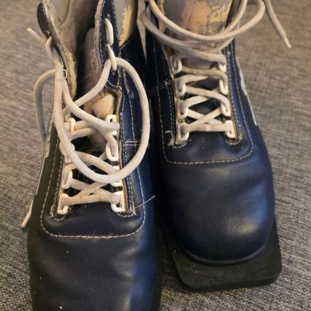 Alpina NNN 102 langrennsstøvler i blå og lyse detaljer. Støvlene har snøring foran og høyere ankelparti for ekstra støtte. Sålen er tilpasset NNN-bindinger. Egnet til klassisk langrenn. Yttermateriale i syntetisk materiale og lær-/skinnlook, med tekstilfôr innvendig for økt komfort. Passer til bruk på tur og trening i preparerte løyper. Hele og greie sko, mye bruk igjen på de. Selges kroner 200.