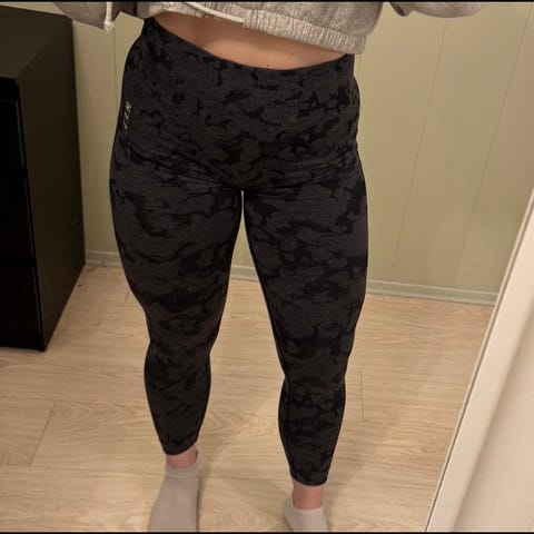 Gymshark treningstights for dame i størrelse M. Tightsen er hellang og i grå farge, egnet til fitness og annen trening. Elastisk materiale som sitter tett på kroppen og gir god bevegelsesfrihet under aktivitet. Logo fra Gymshark synlig på benet.
