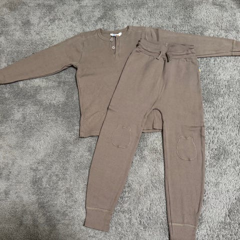 Joha sett med longs og trøye med ull utside og bambus innside. Unisex, i størrelse 116/122. Settet består av langermet overdel med mønster og ensfargede brune longs.