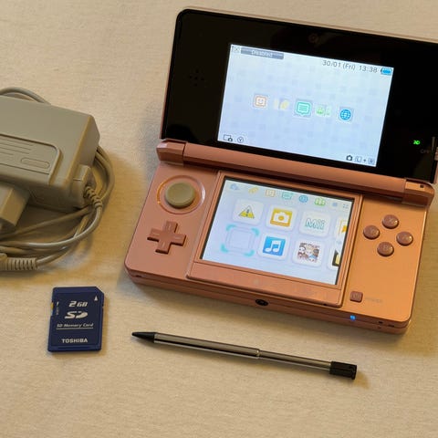 På bildene følger det med strømadapter og et SD-minnekort på 2 GB. Det vises også et R4 SDHC-kort. Konsollen har kortplass for spillkassetter og SD-minnekort på siden.