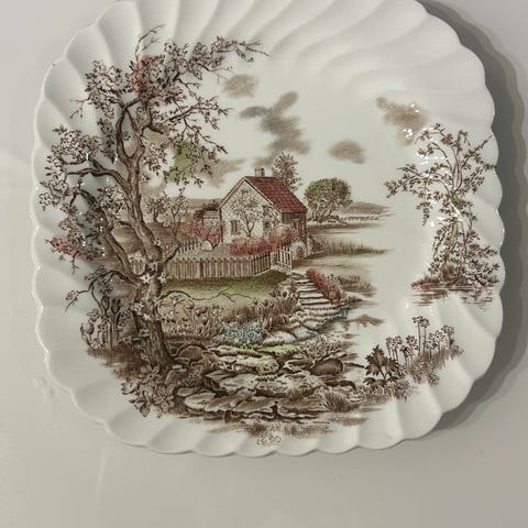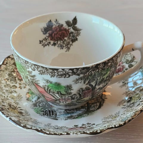 Vintage kopp fra Johnson Bros, produsert i England. Klassisk landlig motiv i duse vårfarger. Dekor under glasur.