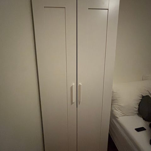 Selges da vi skal endre til åpen garderobeløsning. Hentes på Frysja i 4. etg med heis. Dørene kan demonteres om ønskelig for å gjøre det noe lettere å håndtere, men usikker på om det lar seg demontere stort mer enn det.