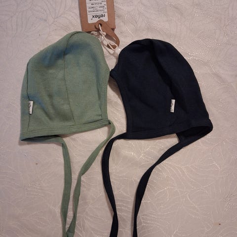 Reflex babylue i merinoull i grønn farge. Luen er i størrelse 56, merket 35–37 cm NB, og passer til nyfødt. Modellen har øreklaffer og knyting under haken for å sitte godt på hodet. Strikket struktur med dusk på toppen. Materiale: 100 % merinoull. Unisex-modell egnet for både gutter og jenter.