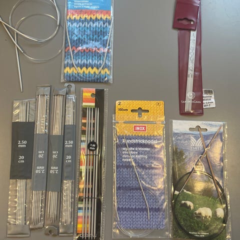 Pakke med diverse håndarbeidsutstyr. Inneholder blant annet rundpinner og strømpepinner i ulike størrelser, heklenål, målebånd, synåler, strykemerker med norske flagg, blonder og bånd, samt ovale lapper til forsterkning eller reparasjon av plagg. Egnet til strikking, søm, reparasjon og dekorasjon av klær og tekstiler.