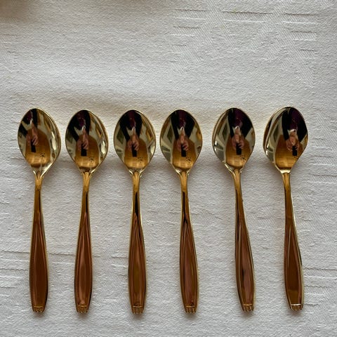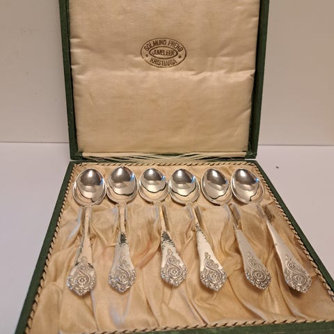 Sandrik tesett bestående av 10 sølvfargede skjeer med dekorert skaft. Settet leveres i originalt etui med blå innside og plass til skjeene. Egnet som teskjeer eller til servering av desserter og andre varme drikker.