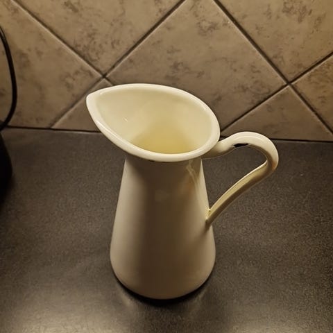 Mugge med fruktmotiv og blomsterdekor. Muggen har bølget kant og dekorert hank, samt gullfarget kant øverst. Egner seg til servering, eller som dekorativ gjenstand. Høyde 15 cm
