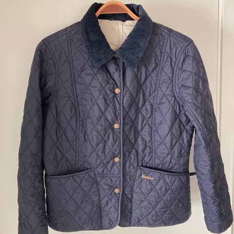 Barbour Utility Quilt jakke for dame i størrelse S. Jakken er quiltet, med mørk blå farge. Modellen har krage med blomsterstoff på innsiden, knapp- og glidelåslukking foran samt flere frontlommer med klaff. Egnet som lett ytterjakke i overgangssesonger og milde dager.