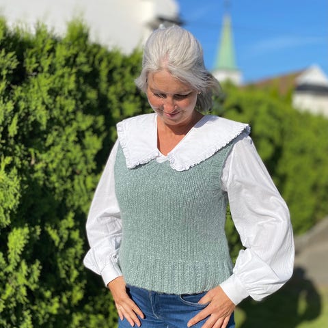 Hjemmestrikket vest i brunt garn Air fra Drops.