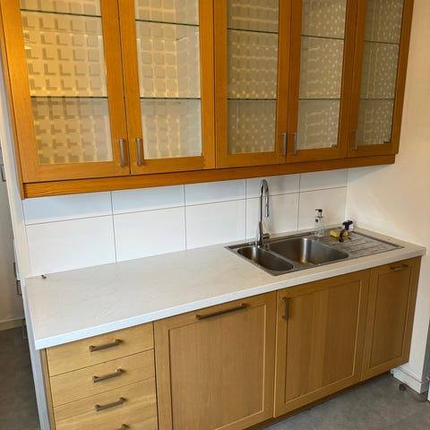 Kjøkkeninnredning i hvit utførelse med overskap, underskap og benkeskap. Innredningen består av skap med hyller for oppbevaring, skuffeseksjon og benkeplate. Det er integrert stålvask med ettgreps blandebatteri. Løsningen passer for enklere kjøkken, pauserom eller hybelkjøkken der det er behov for grunnleggende kjøkkenfunksjoner og oppbevaringsplass.