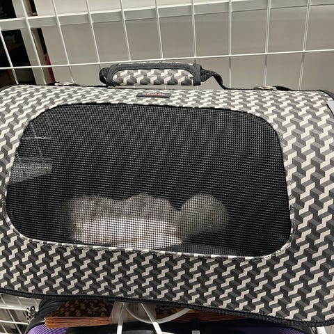 Kjæledyr transportbag i blå tekstil med svarte detaljer. Bagen har nettingpaneler på sidene for lufting og innsyn, samt glidelåsåpning. Den har bærehåndtak og skulderreimfeste for enkel bæring.