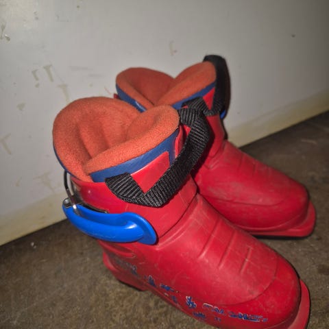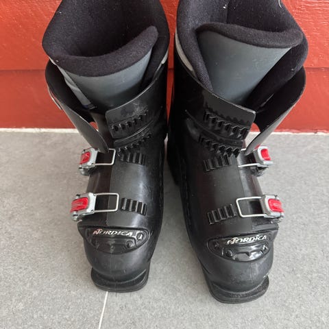 Nordica Astral 120 alpinstøvler i rød farge. Støvlene er litt ødelagte ved der man strammer dem