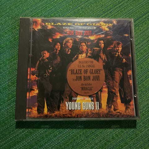 Jon Bon Jovi Blaze Of Glory CD album. Soundtrack til filmen Young Guns II. Standard plastcover med trykt cover foran og bak samt booklet på innsiden. Inneholder låter som blant annet "Blaze Of Glory" og øvrige spor fra albumet, oppført på baksiden av coveret. Format: lyd-CD.