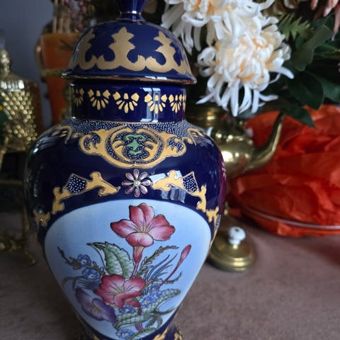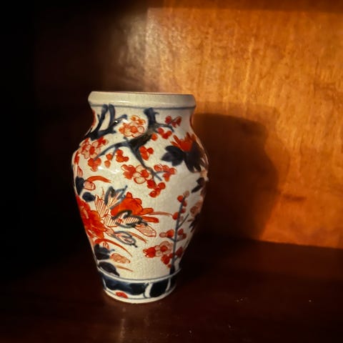 Dekorativ liten vase i kinesisk porselen, håndmalt med plommeblomster i jernrød / brun tone mot lys, nesten celadonaktig glasur. Motivet er inspirert av tradisjonell kinesisk “meihua” (plommeblomst), et klassisk symbol på styrke og fornyelse.