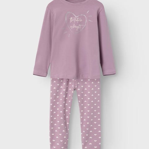 Sett med sweatshirt og leggings: Rosa med fargerike hjerter. Genseren har fine volanger på skuldrene. (Nypris 299,-)