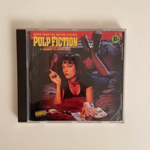 MCA Pulp Fiction CD soundtrack. Original filmmusikk fra filmen «Pulp Fiction», utgitt på CD i standard plastetui. Inneholder ulike låter fra filmens soundtrack, med oversikt over spor og spilletid på baksiden av coveret. Passer til avspilling på CD-spillere som støtter vanlige lyd-CD-er.