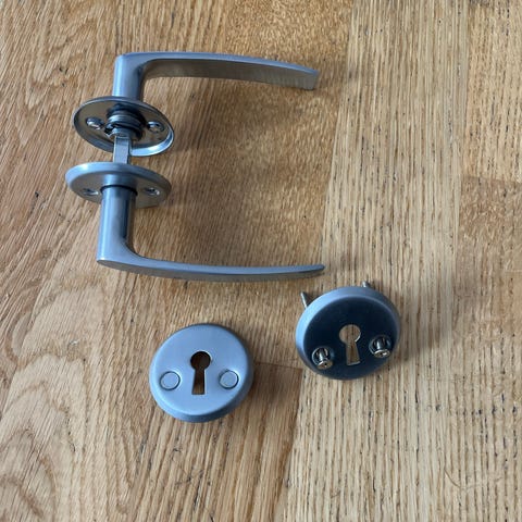 Søkeord: dørvrider, innerdørhåndtak, krom, satin chrome, nøkkelskilt, dørbeslag, Jula, Hard Head