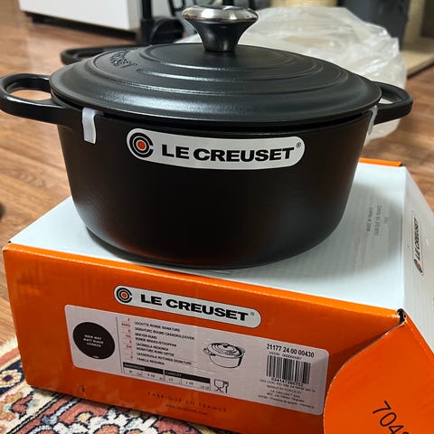 Helt ny Le Creuset Signature gryte i støpejern med diameter . Gryten har emaljert innside i lys kremfarge og oransje utside med matchende lokk og metallknott. To sidehåndtak gir godt grep ved løfting. Egnet til tilberedning av gryteretter, supper og annen matlaging på komfyr og i stekeovn, i henhold til produsentens anvisninger.