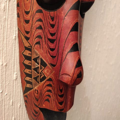 Den kommer fra Fenne glassverk (Glashütte Fenne), modell «Isolde» fra 1930-1950.Glasset er presset i rav. Den enkle formen er dekorert med pregede blomstermønstre.