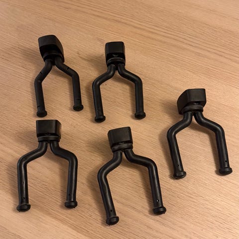 Krokene har to parallelle armer med gummierte ender og rund festedel med hull for montering. Egnet for både gitar og bassgitar. Originale skruer medfølger.