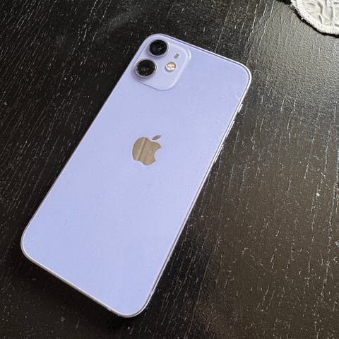 Apple iPhone 12 mini smarttelefon i hvit, batterikapasitet er på 86 % er litt merke på nederst kameraet. Nesten ikke synlig.