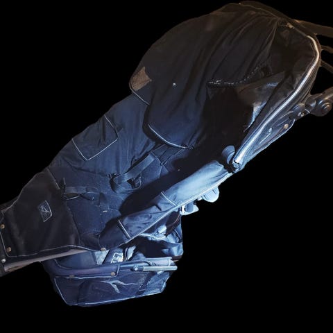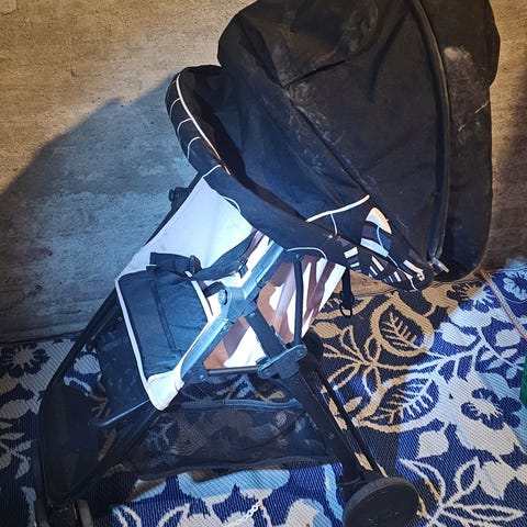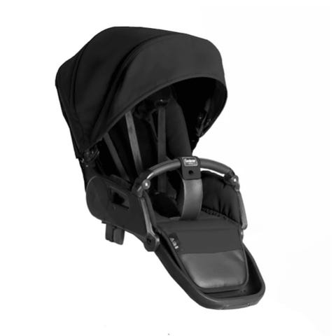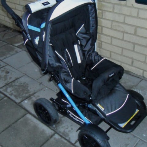 Barnevogn i svart farge. Vognen har fire hjul, justerbart håndtak og sitteenhet med bøyle foran. Egnet for småbarn, med mulighet for å regulere sittestilling. Passer til bruk på turer og i hverdagen der det er behov for en praktisk vogn til barnetransport.