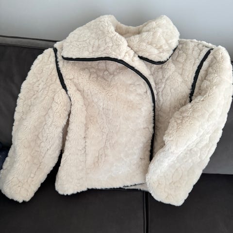Gina Tricot jakke for dame i størrelse M. Jakken er beige og laget i polyester. Modellen har rett passform med knapper i front og lommer i sidene. Den har hette med myk, fluffy kant og oppbrettbare ermer. Egner seg som en kort, lett ytterjakke til hverdagsbruk. Lite brukt! Passer alt fra S-L, bare spør om flere bilder!