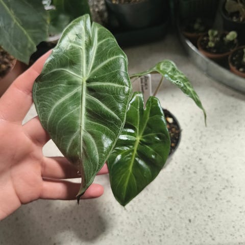 Nydelig ungplante av Alocasia Sinuata Albo selges😊 Frisk og fin plante, masse sunne røtter. Er plantet i stratum og perlite. Har hatt fin varigering hele tiden👍🏼