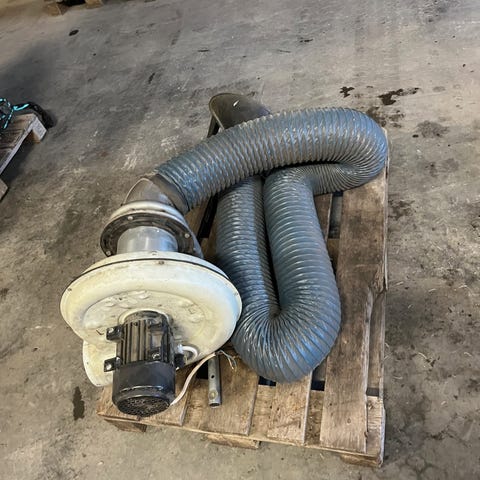 Selger kraftig industriell ventilasjonsvifte med tilhørende spiralrør, bend og koblinger. Har vært brukt i verkstedmiljø og fungerer som den skal.