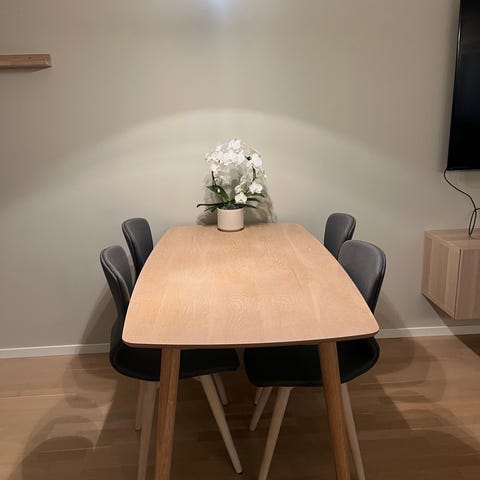 Nagano spisebord fra Skeidar. Hvitoljet eikefiner med ben i heltre eik. Pris i butikk er 7999 kr. Et lite hakk (se bilde). Ellers i svært god stand. Ble pusset ned og behandlet med hvitolje for to år siden. Spisebordet er litt smalere og derfor plasseffektivt. Bordbeina kan skrus av og gjør frakten enklere. Må hentes hos meg på Ensjø. Tilgang til heis. Link: https://www.skeidar.no/alle-produkter/alle-bord/spisebord/nagano-spisebord/
