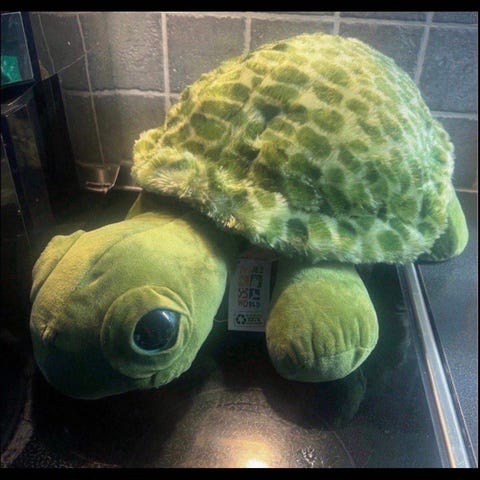 Ky skilpadde kosedyr i grønn farge. Myk og polstret plysjskilpadde med stort skjell og brodert/trykt ansikt. Passer som kosedyr for barn eller som pyntegjenstand på barnerom.