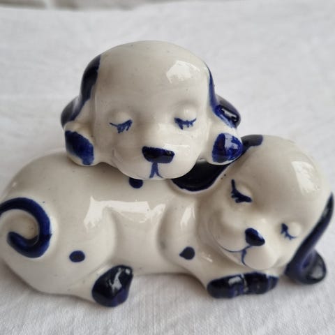 Sjarmerende salt, pepper og tannpirker-sett i hvitt porselen med blå dekor, formet som tre små hundevalper.