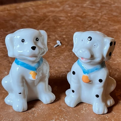 Salt- & pepper-sett + tannpirkerholder – hundevalper i porselen