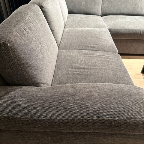 Sofa med høyre side sjeselong. Beige med store løse puter. Stoff som er slitesterkt og lett å holde rent. Elsker sofaen og selges på grunn av plassmangel i ny leilighet