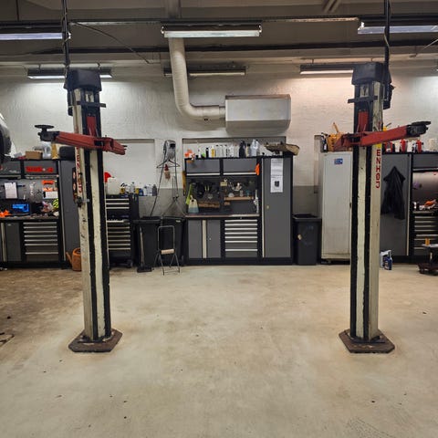 Har skinne i taket for å løfte på bil/henger.