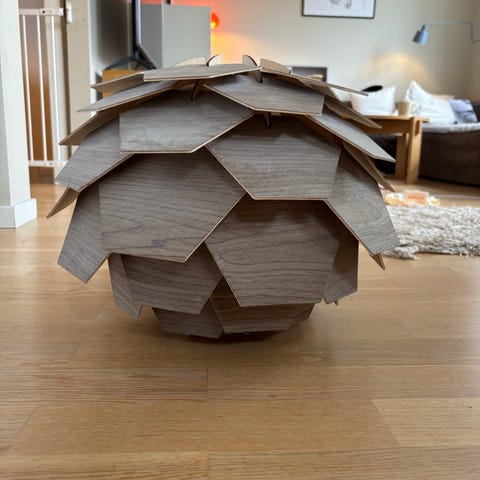 Har fire stk lekre Nova Life origami taklamper 45cm som passer et japandi, nordisk, elegant interiør. Tre av lampene er montert i et par dager, ingen bruksmerker som jeg kan se. Fargen er hvit/lys med svart ledning i stoff kvalitet. Matt utførelse på kopp. Kommer med sukkerbit. Dimbar, E27 sokkel.