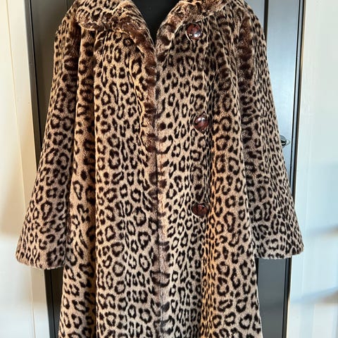 Baum und Pferdgarten kåpe i fuskepels for dame i størrelse M. Kåpen har flerfarget leopardmønster med kontrastfargede mansjetter. Materialet er fuskepels med glatt fôr på innsiden. Passer som yttertøy i overgangssesonger og mildere vinterdager.
