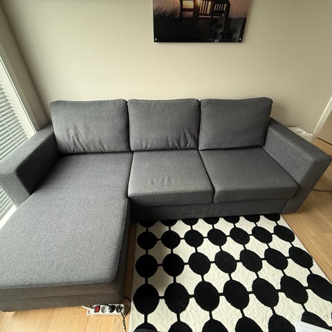 Den er i fin stand, og trekkene kan enkelt tas av og vaskes. Fargen er mørk grå (med hint av blå undertone).