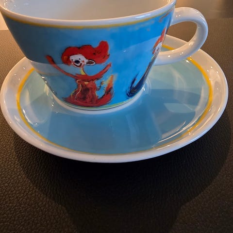 Fint til morrakaffen! Stor kopp, kaffekrus, tekrus av Marianne Aulie. Optimist med klovnefjes, 8,5 cm høy, diam 8 cm.