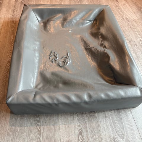 Selger en svart hundeseng i svart skinn. Er i god stand og ikke synlig brukt.