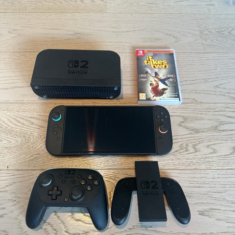 Nintendo Switch 2, beskyttelsesskjerm, handheld grip, deksel og pro kontroller 2