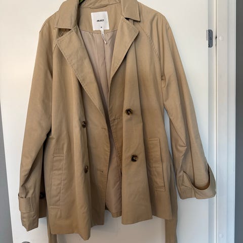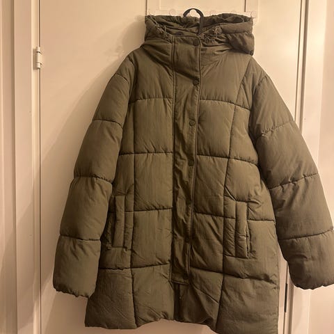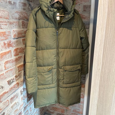 OBJECT lang jakke for dame i størrelse L. Jakken er grønn og laget i polyester. Modellen har hette, lange ermer og går godt ned på låret/leggen. Den har glidelåslukking foran og store frontlommer. Passer som ytterjakke i kjøligere vær.