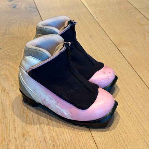 Barneskisko i hvit og rosa farge med hjerte-detaljer. Skoene har mykt, varmt fór på innsiden og snøring foran for justering av passform.