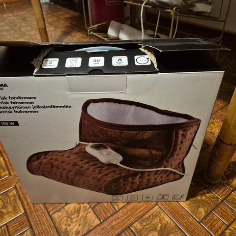 Kjøpte i julegave til søster, men hun ville ha en annen. Trekket kan maskinvaskes. Prøvd på for å se at den virker, og den varmer godt. Passer best for en med fot på maks str 38.