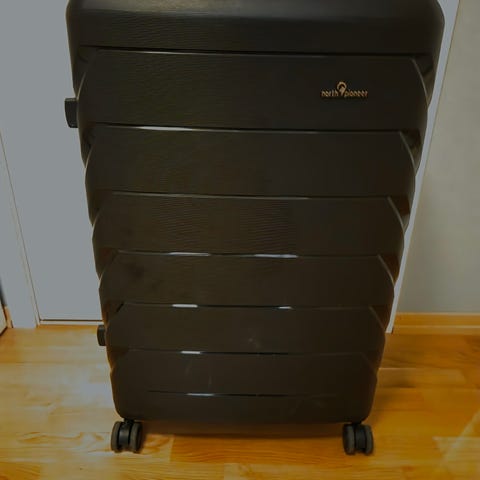 Koffert som passer til håndbaggasje. Er brukt til reiser og bærer noe preg av det, men ingen synlige skader
