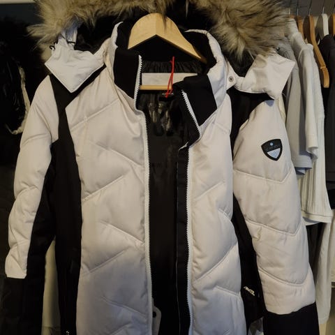 Et feminint snitt i midjen. Avtagbar hette. God og varm.