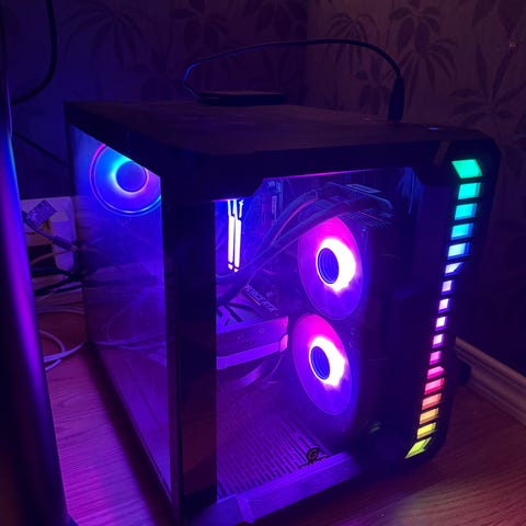 Stasjonær datamaskin fra MSI i tårnkabinett med gjennomsiktig sidepanel og RGB-belysning på vifter. Settet inneholder en skjerm, tastatur og mus. Jeg kjøpte datamaskinen for videoredigering og spilling. Jeg spilte sjelden spill, bare brukte den til videoredigering. Spesifikasjoner: