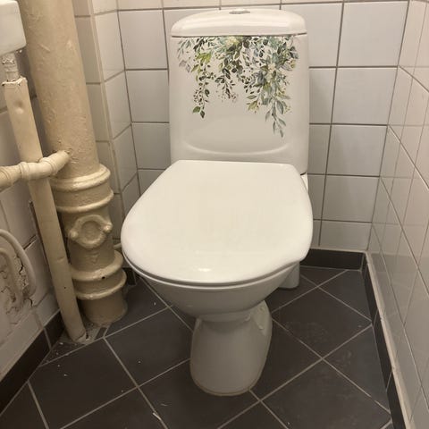 Gulvstående toalett i hvit farge. Klassisk modell med sisterne montert på skålen.